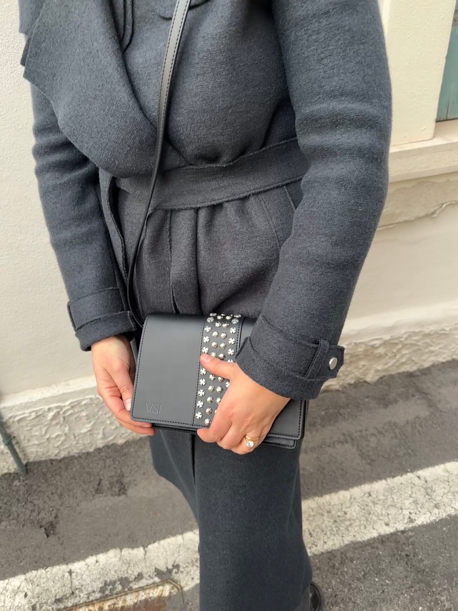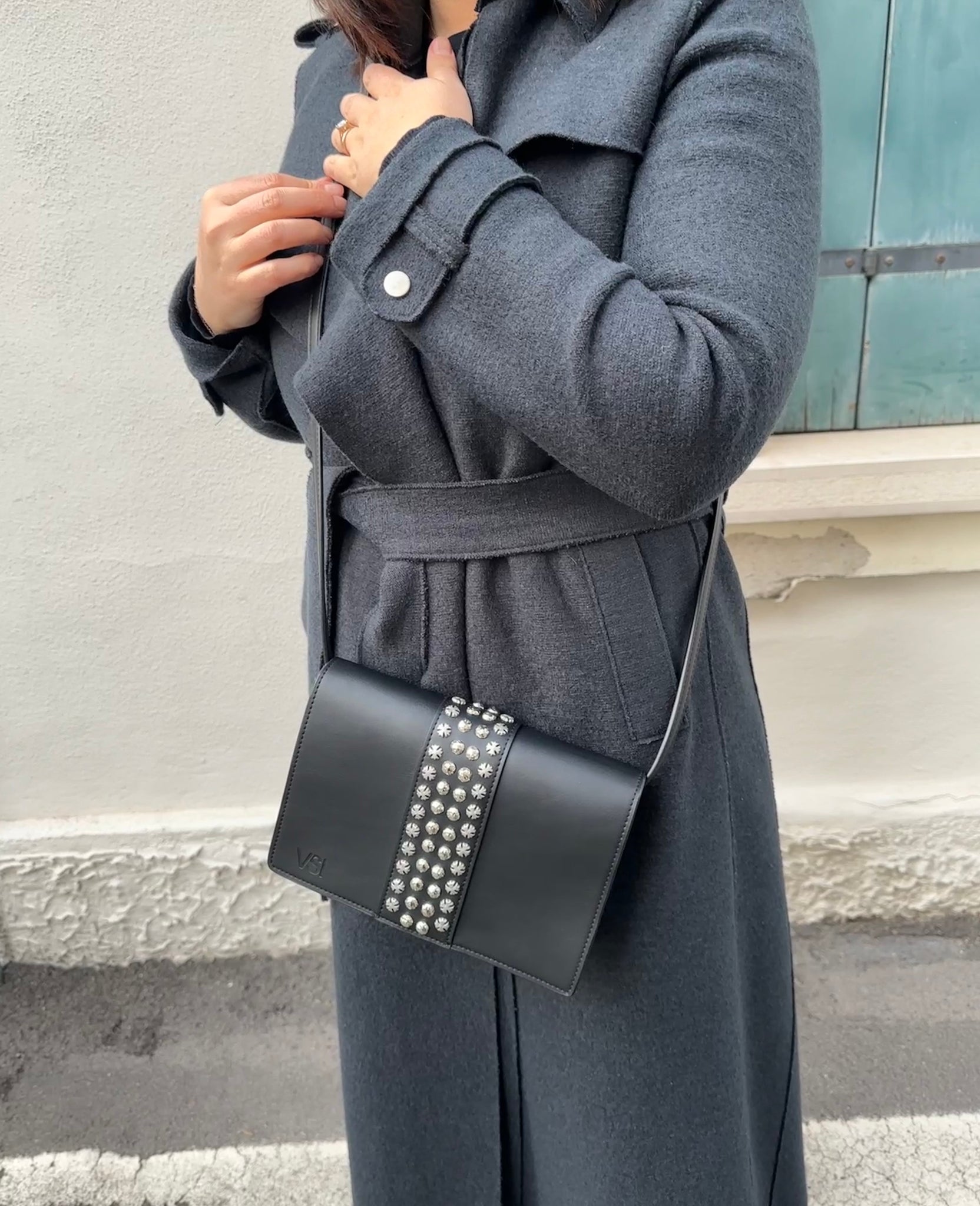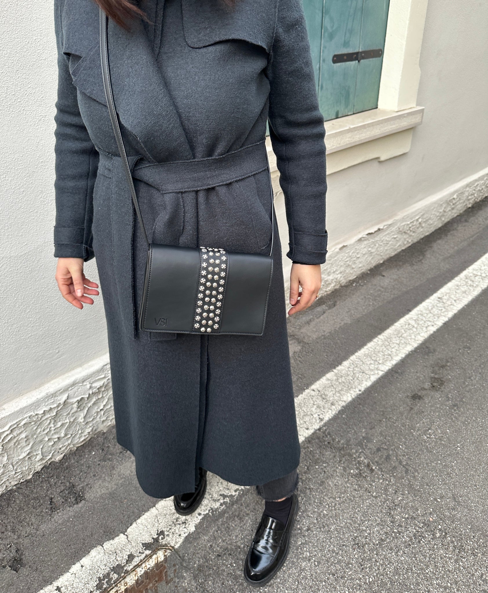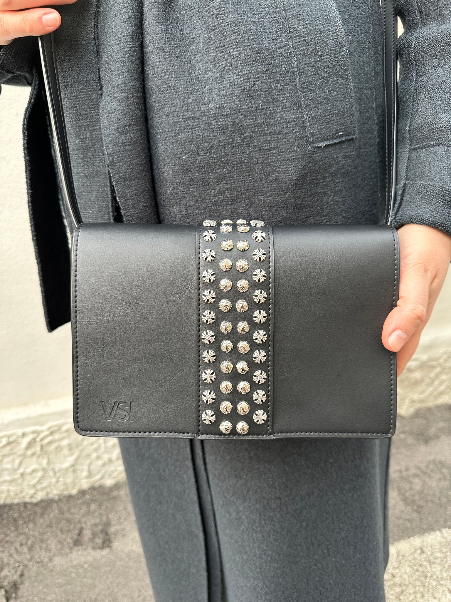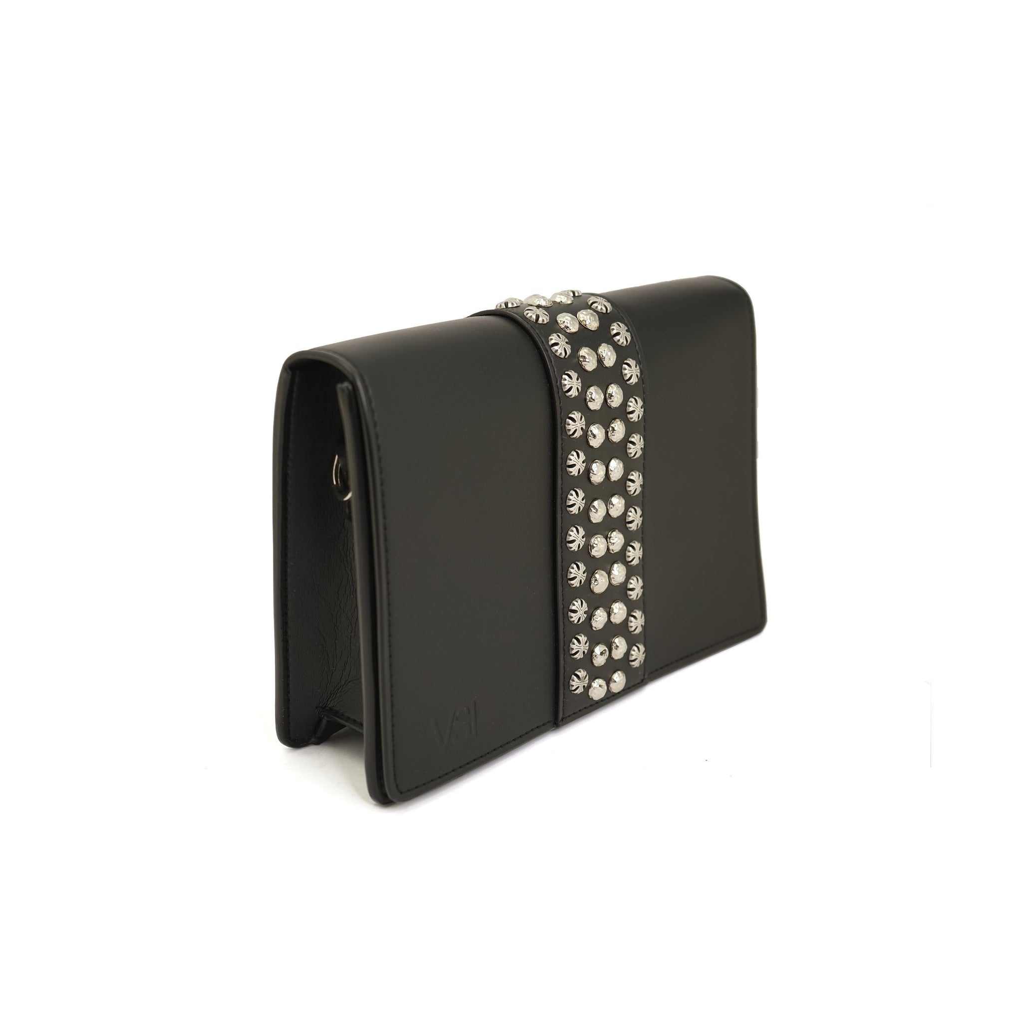 Clutch bag with flap with zamak studs and stars, magnetic button closure
