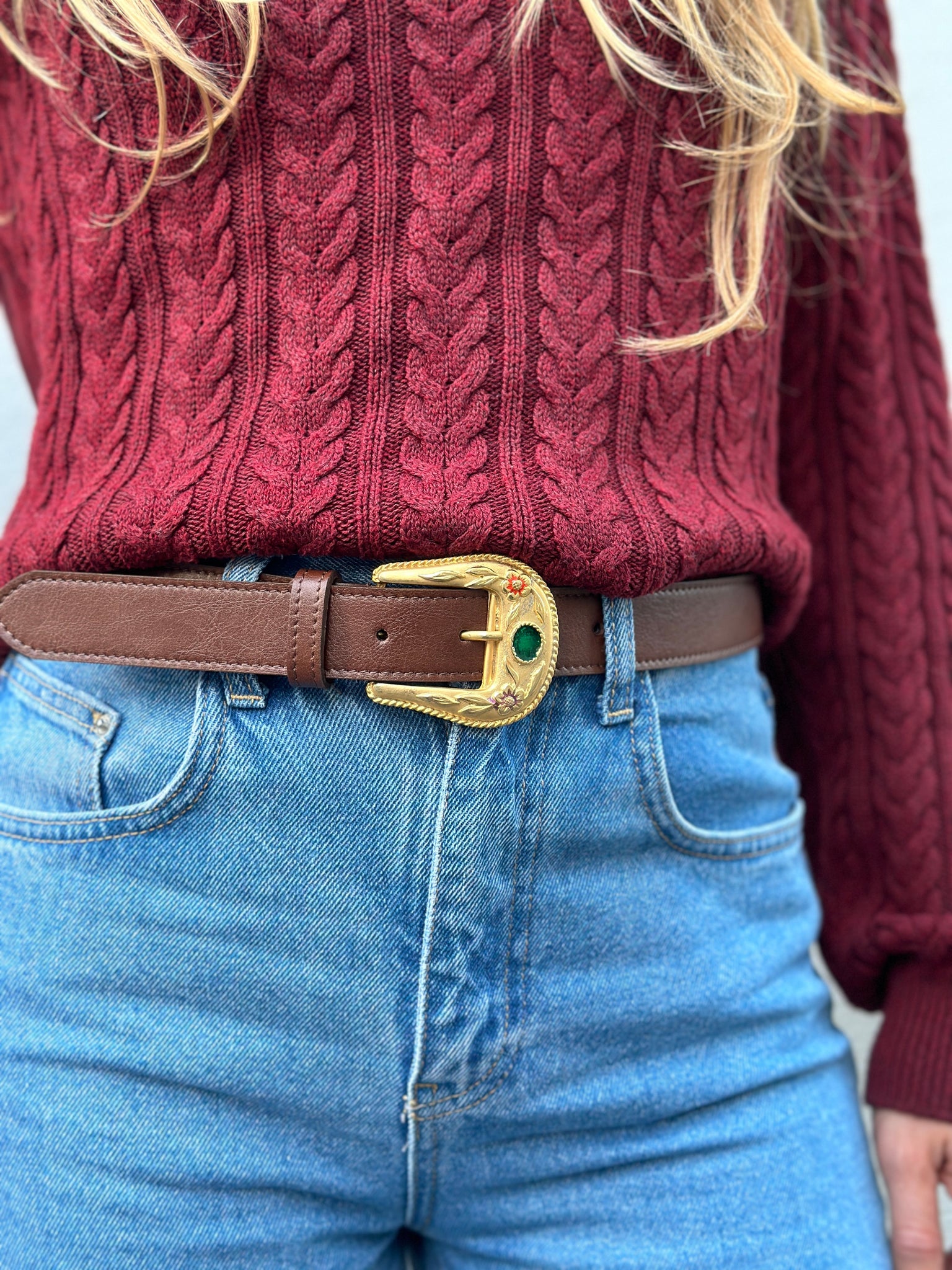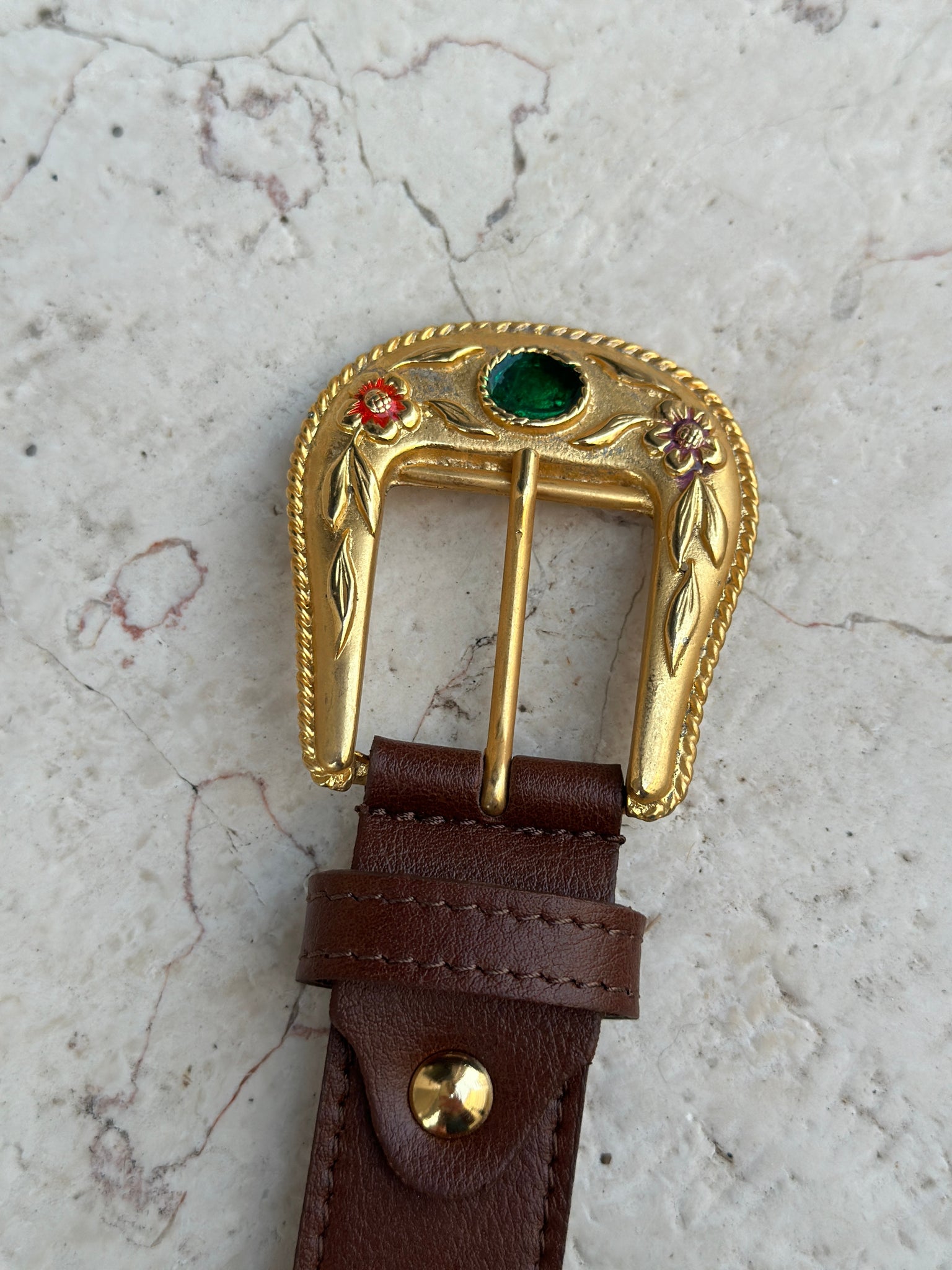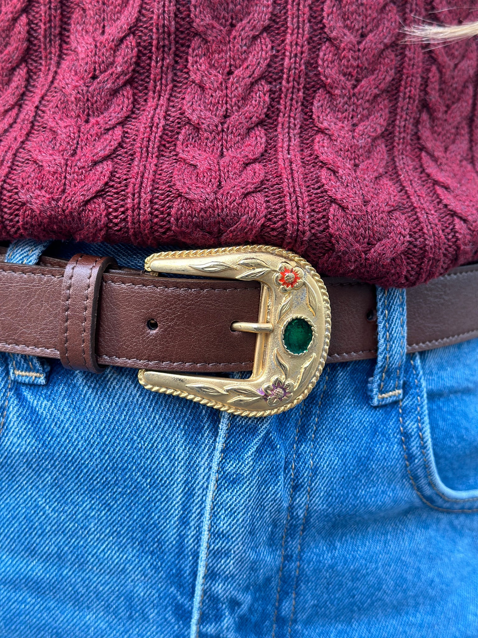 Modello con fibbia piatta grande dorata e dettagli colorati in stile country.