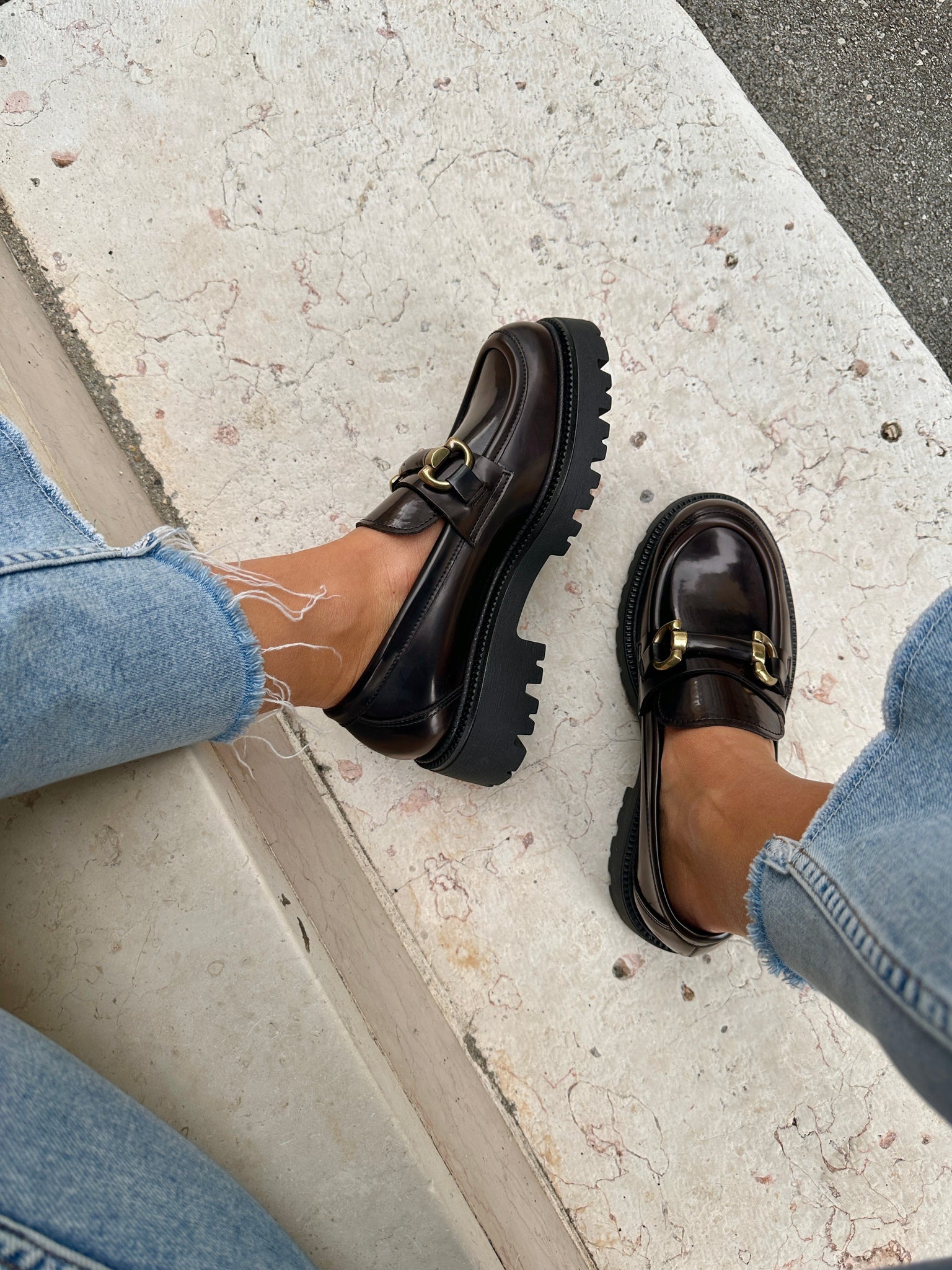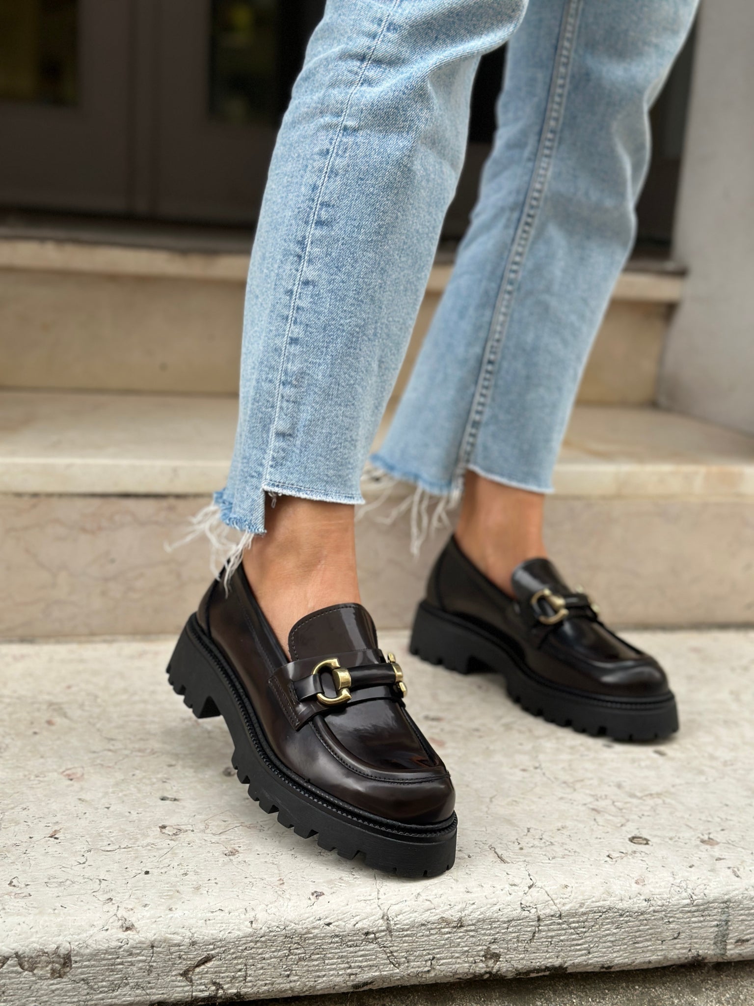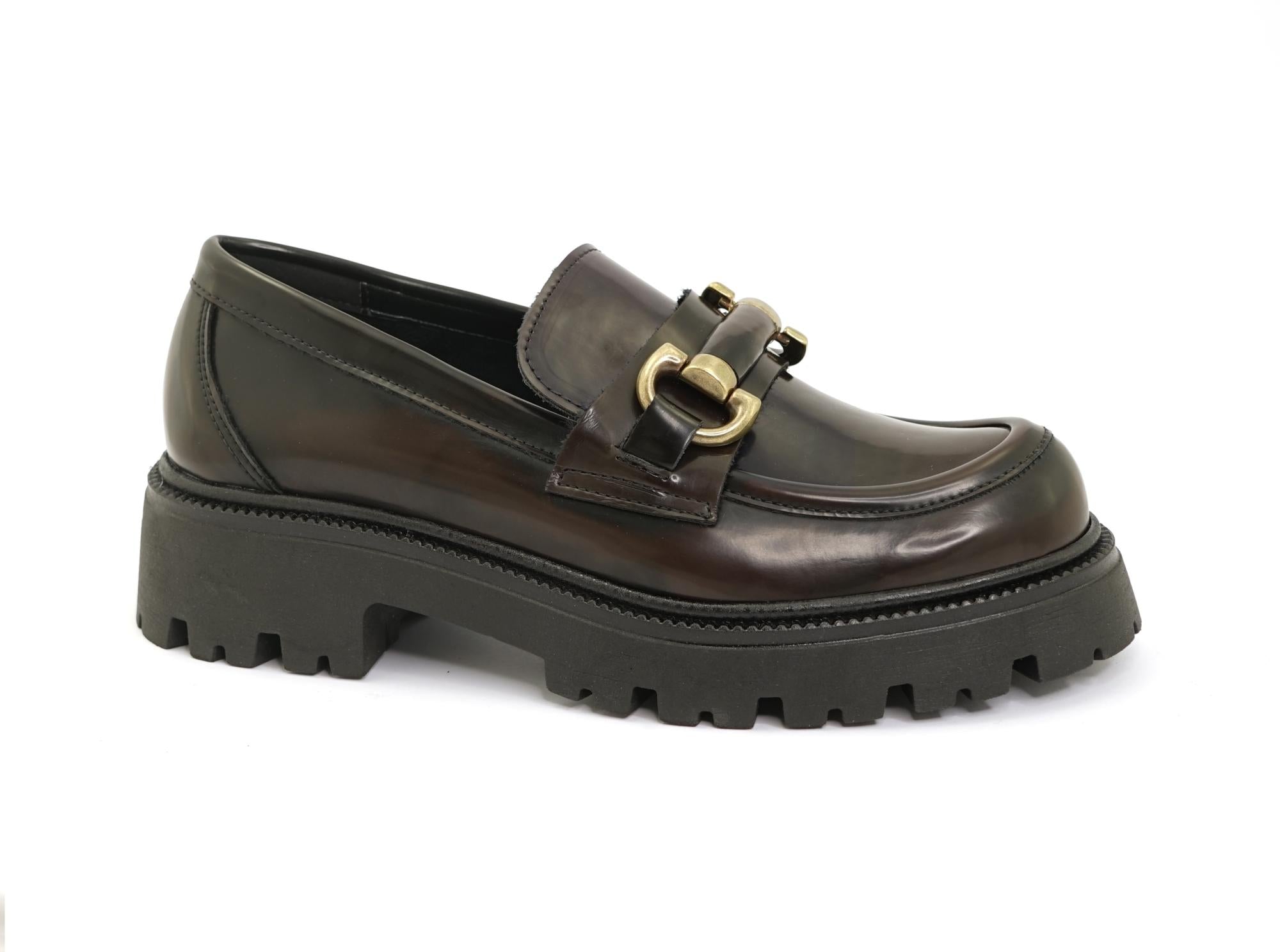Upper in soft, shiny brown microfibre with a patent leather effect