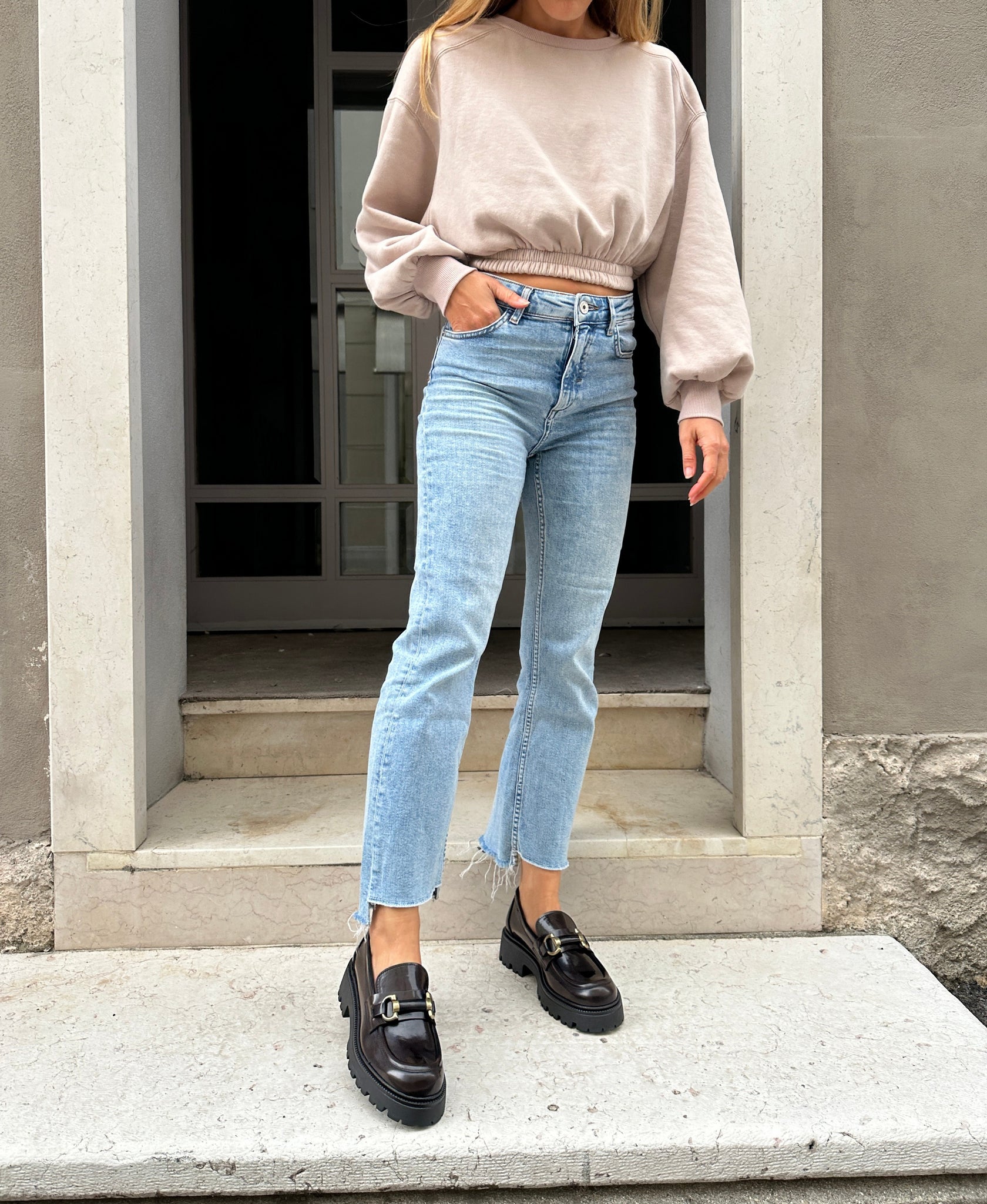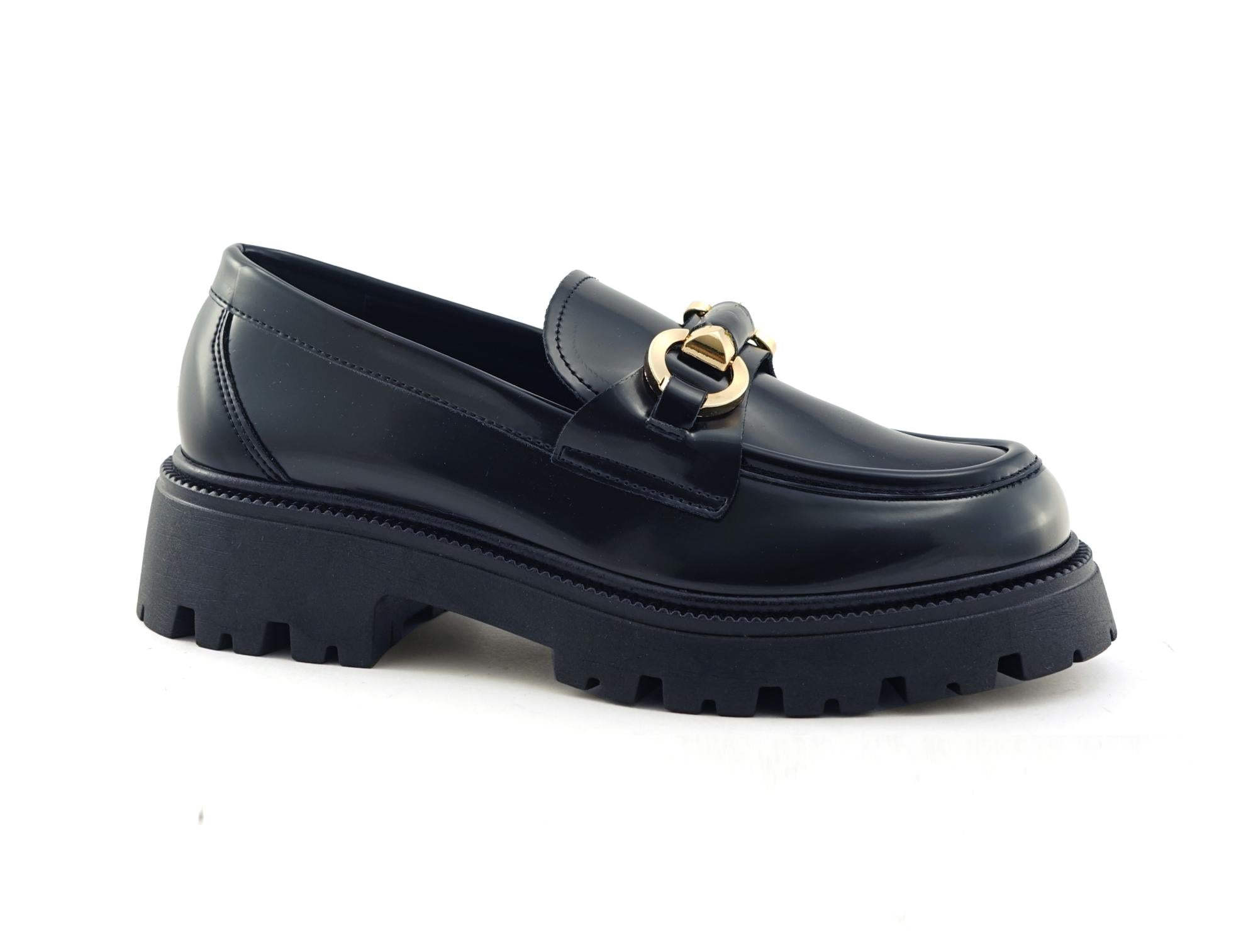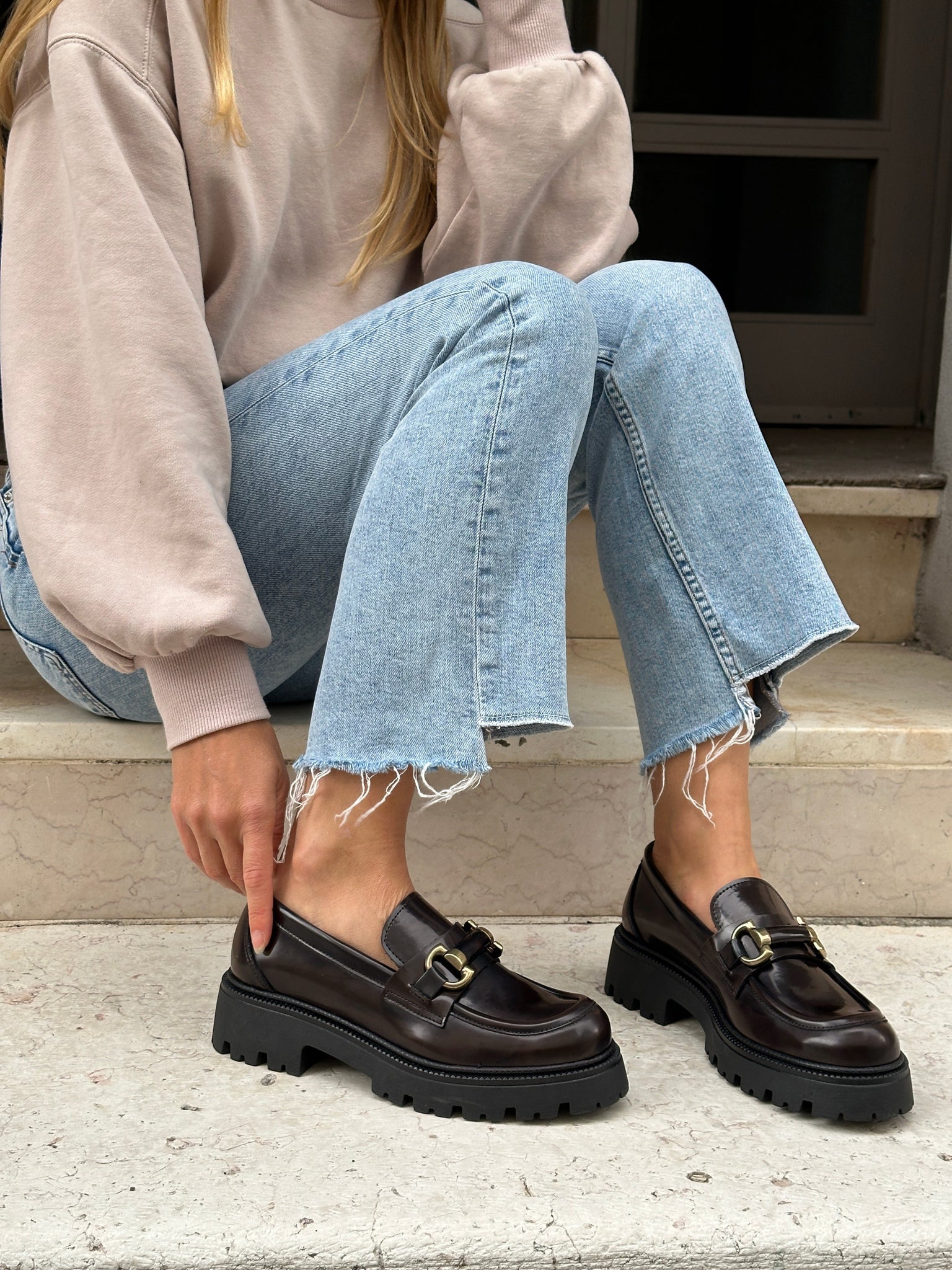 Upper in soft, shiny brown microfibre with a patent leather effect