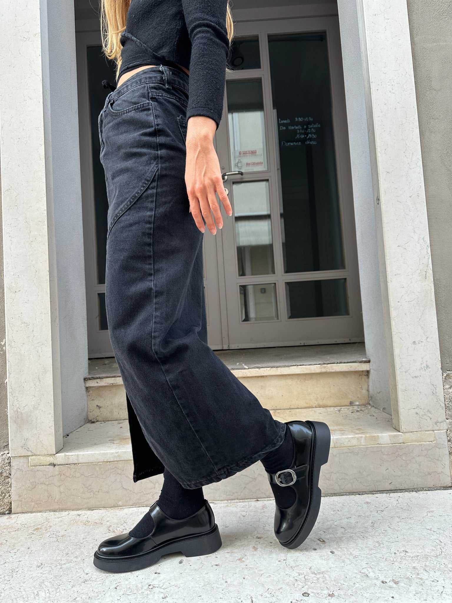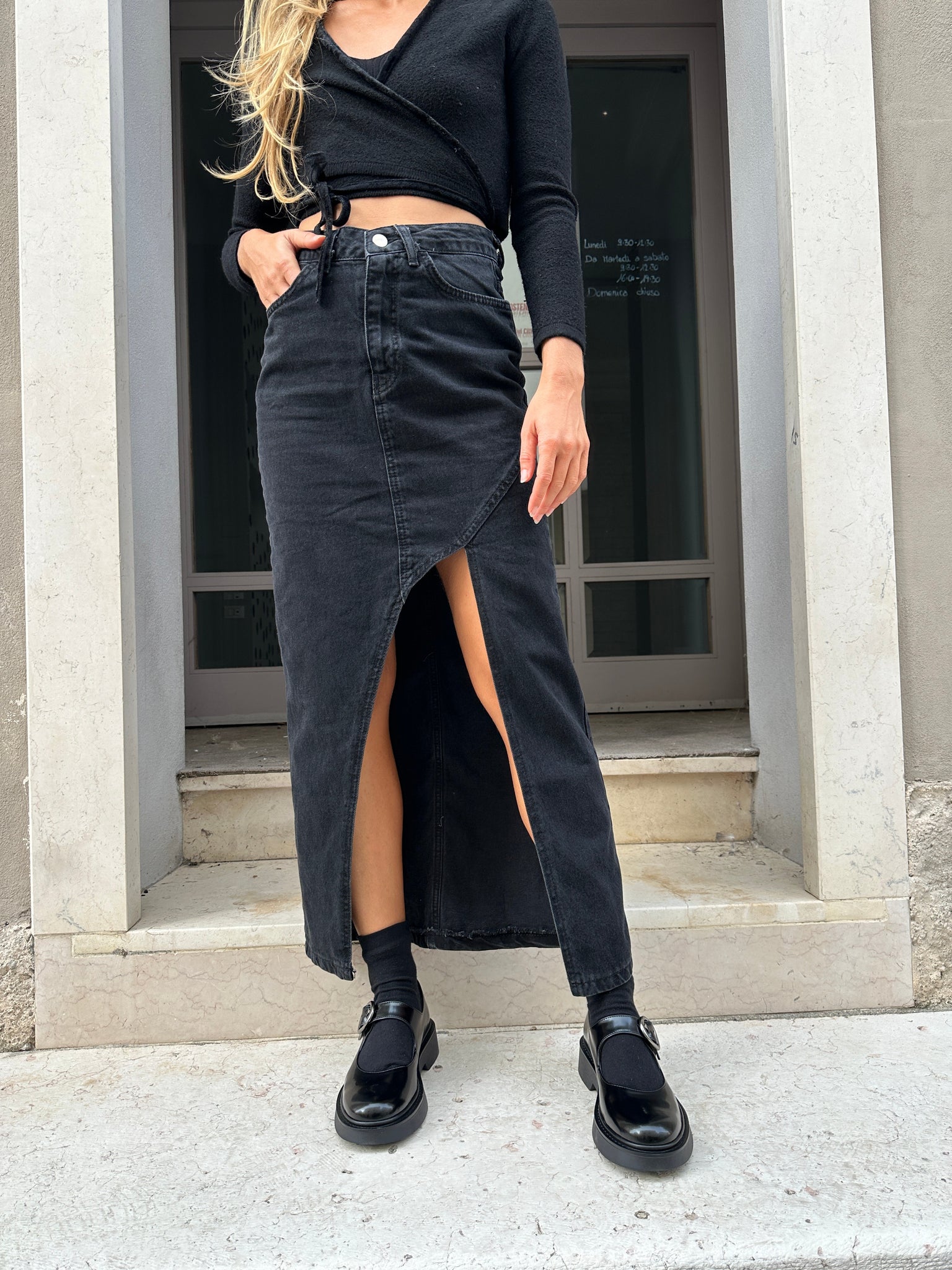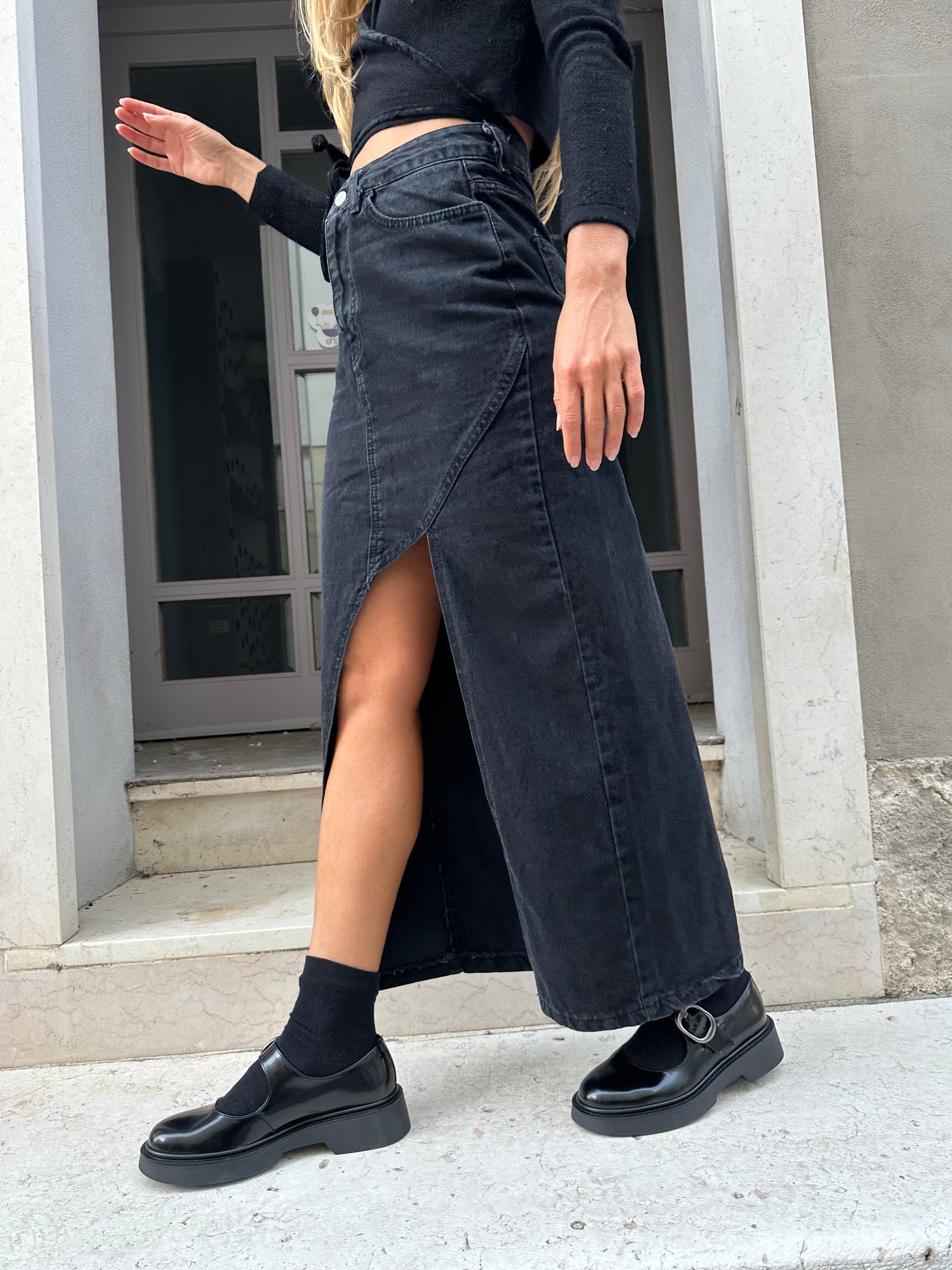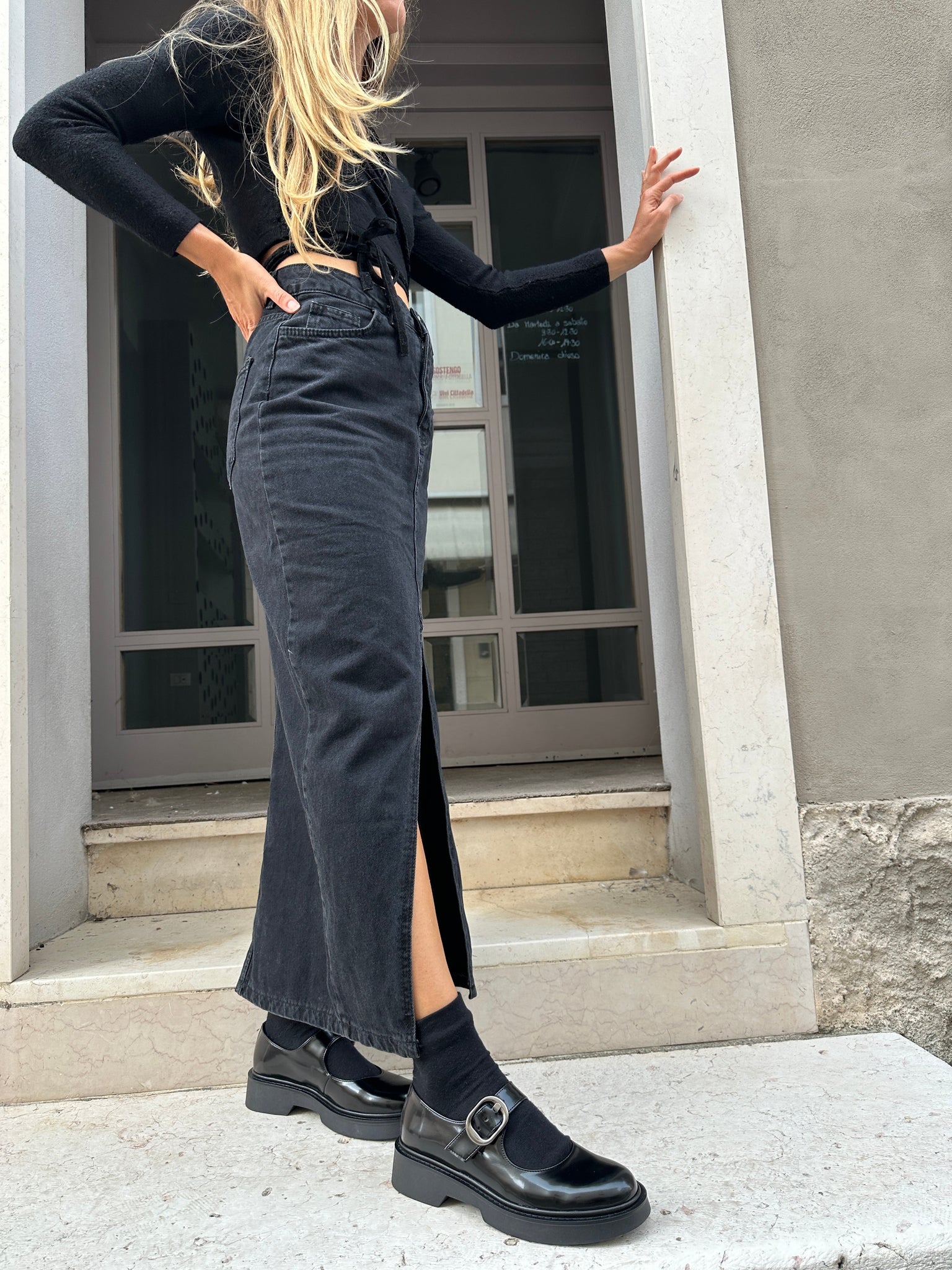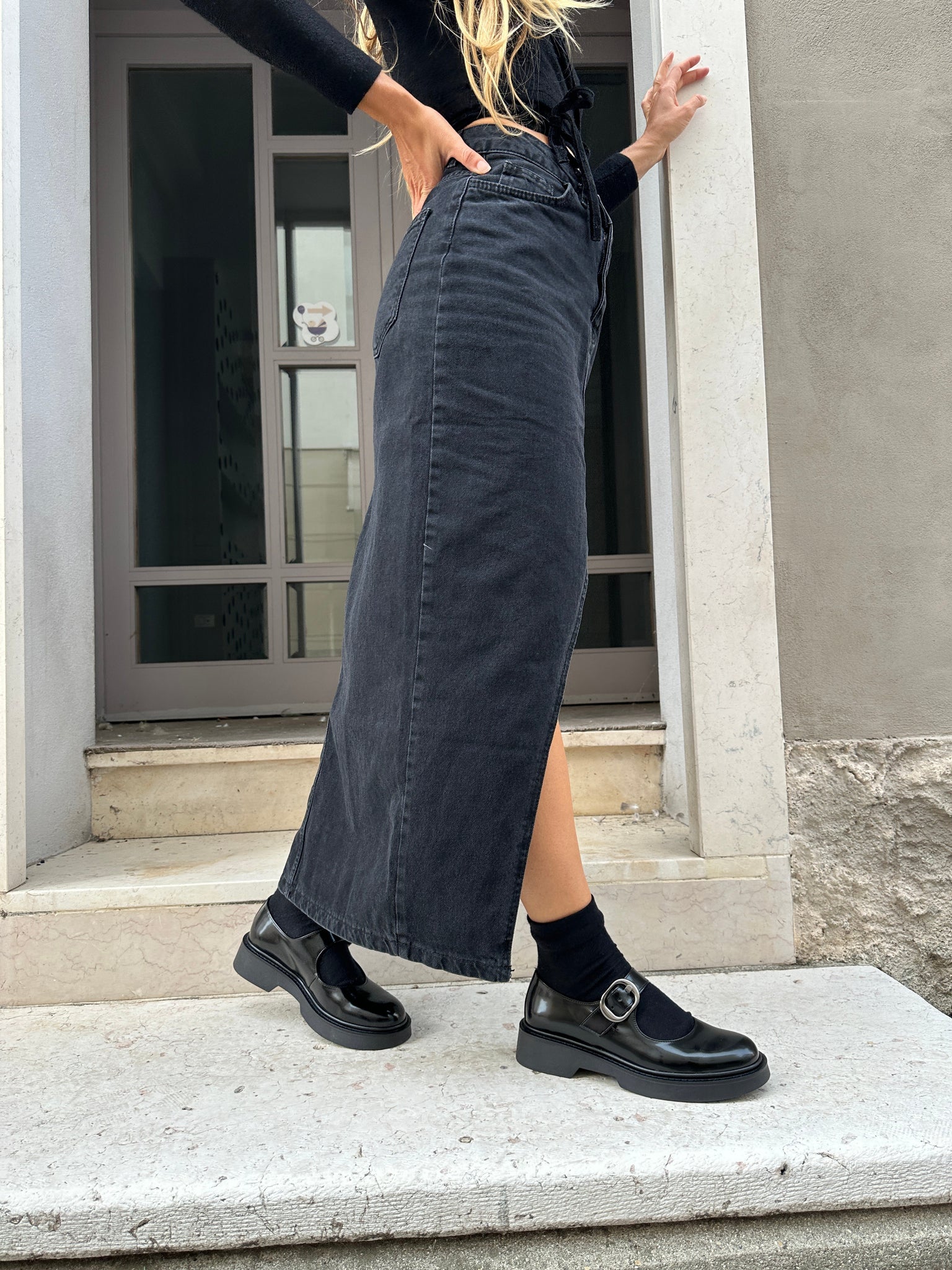 Model with gunmetal buckle closure