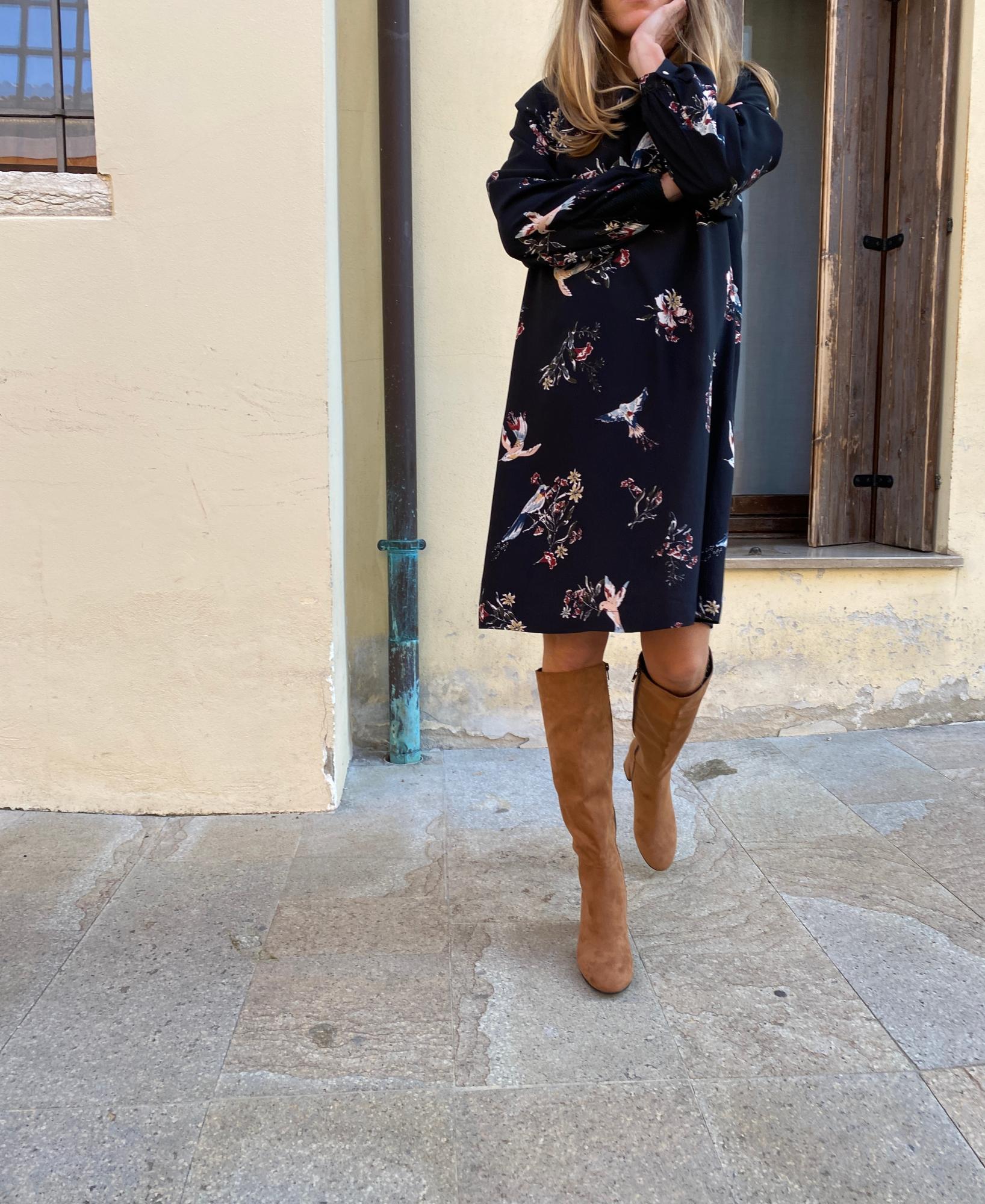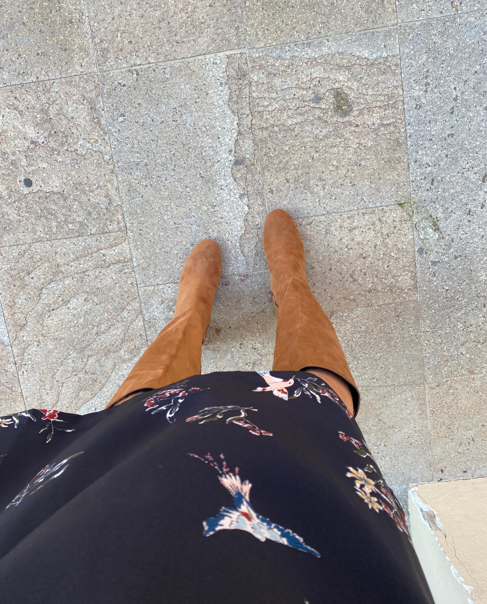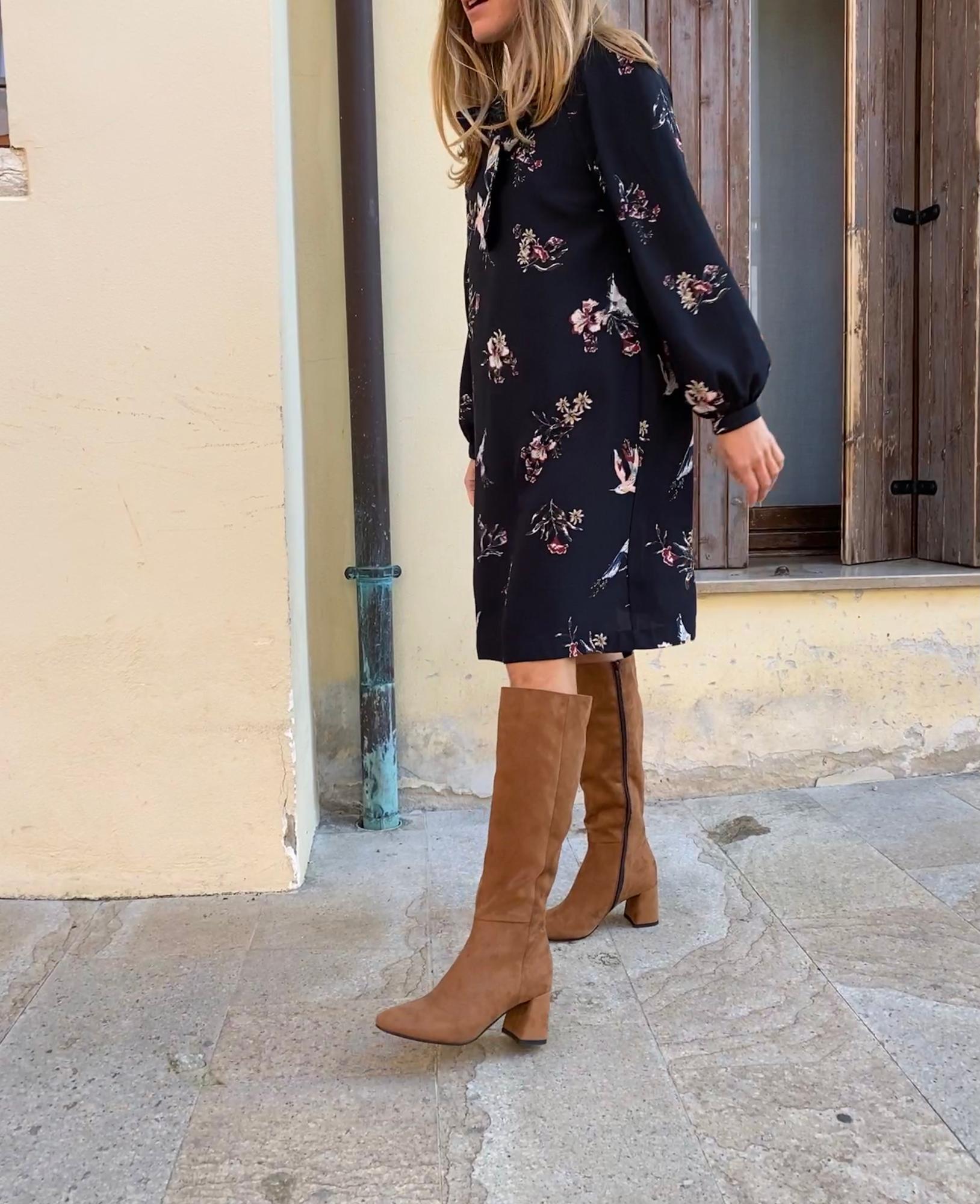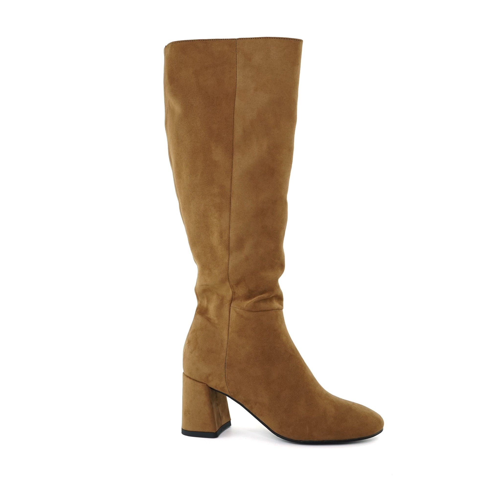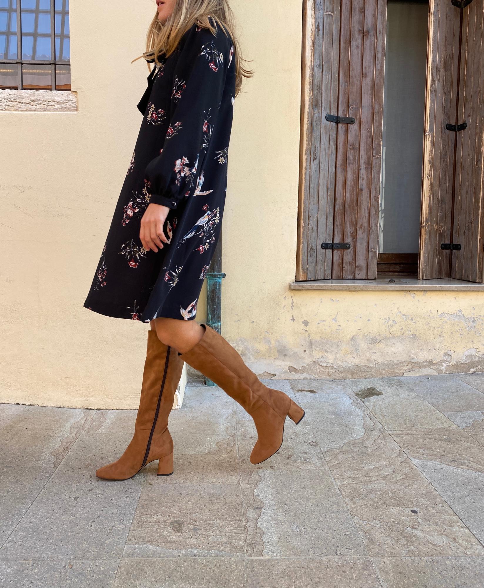 Brown tubular vegan boot below the knee