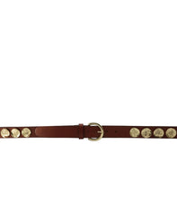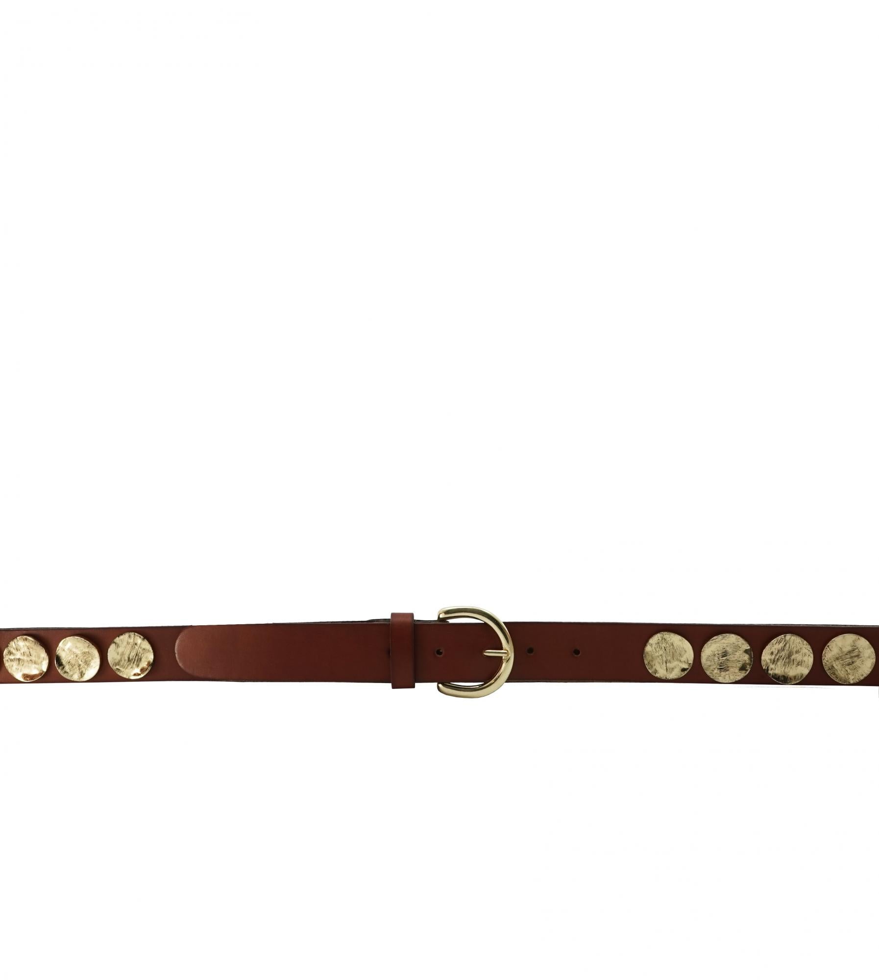 Model with golden coin inserts and rounded buckle
