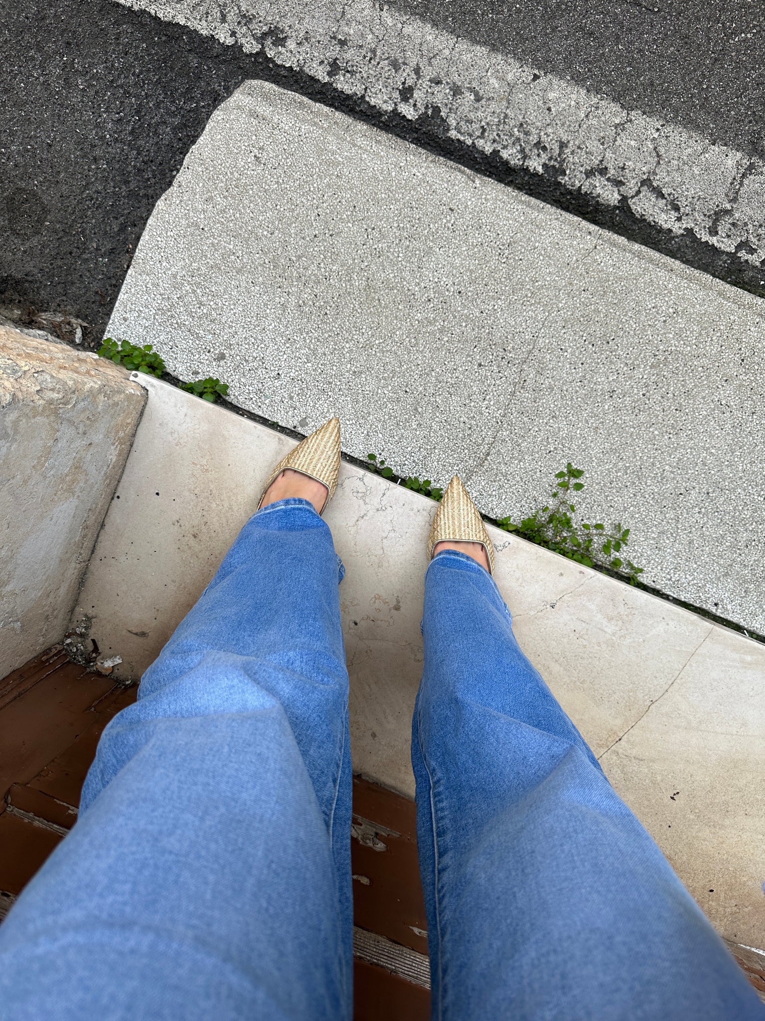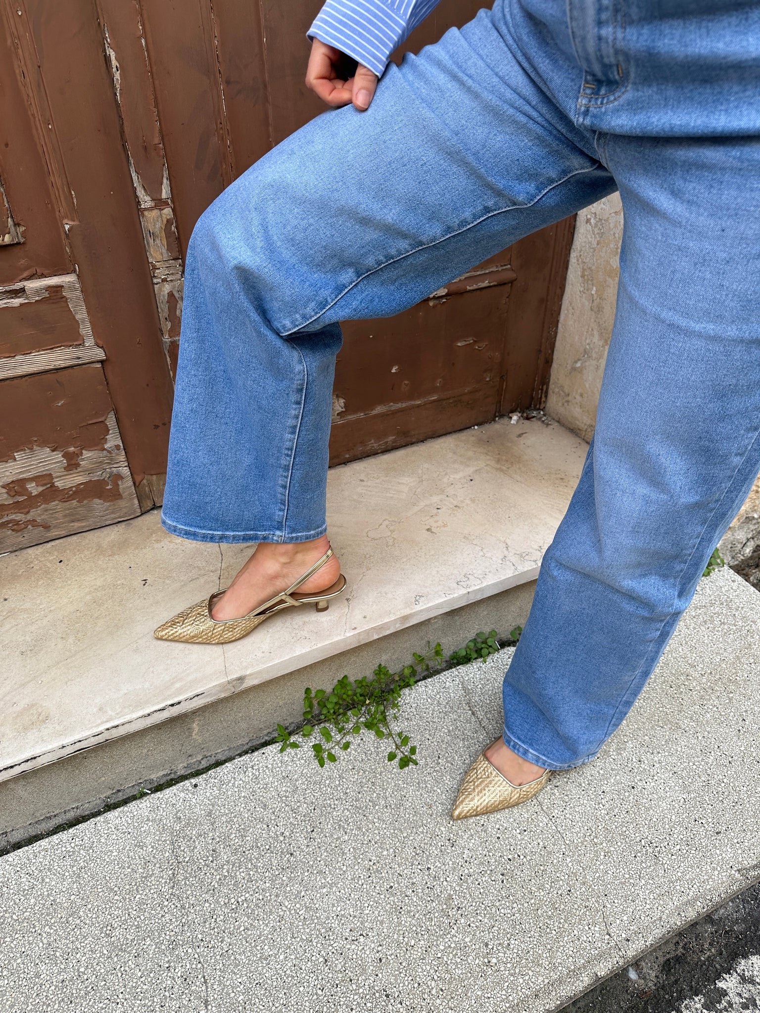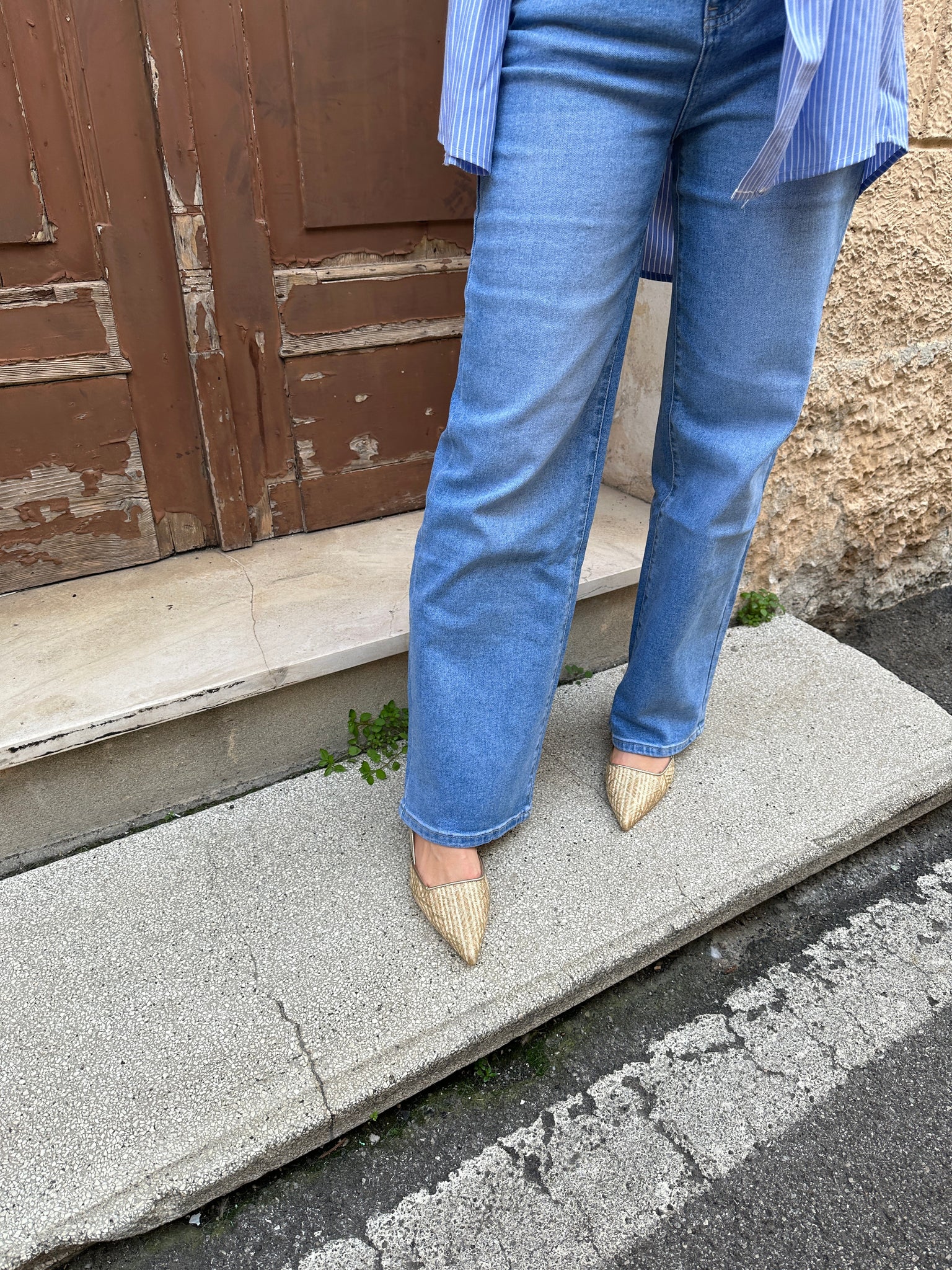 Upper in high quality gold-dyed microfibre with woven raffia toe