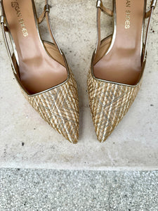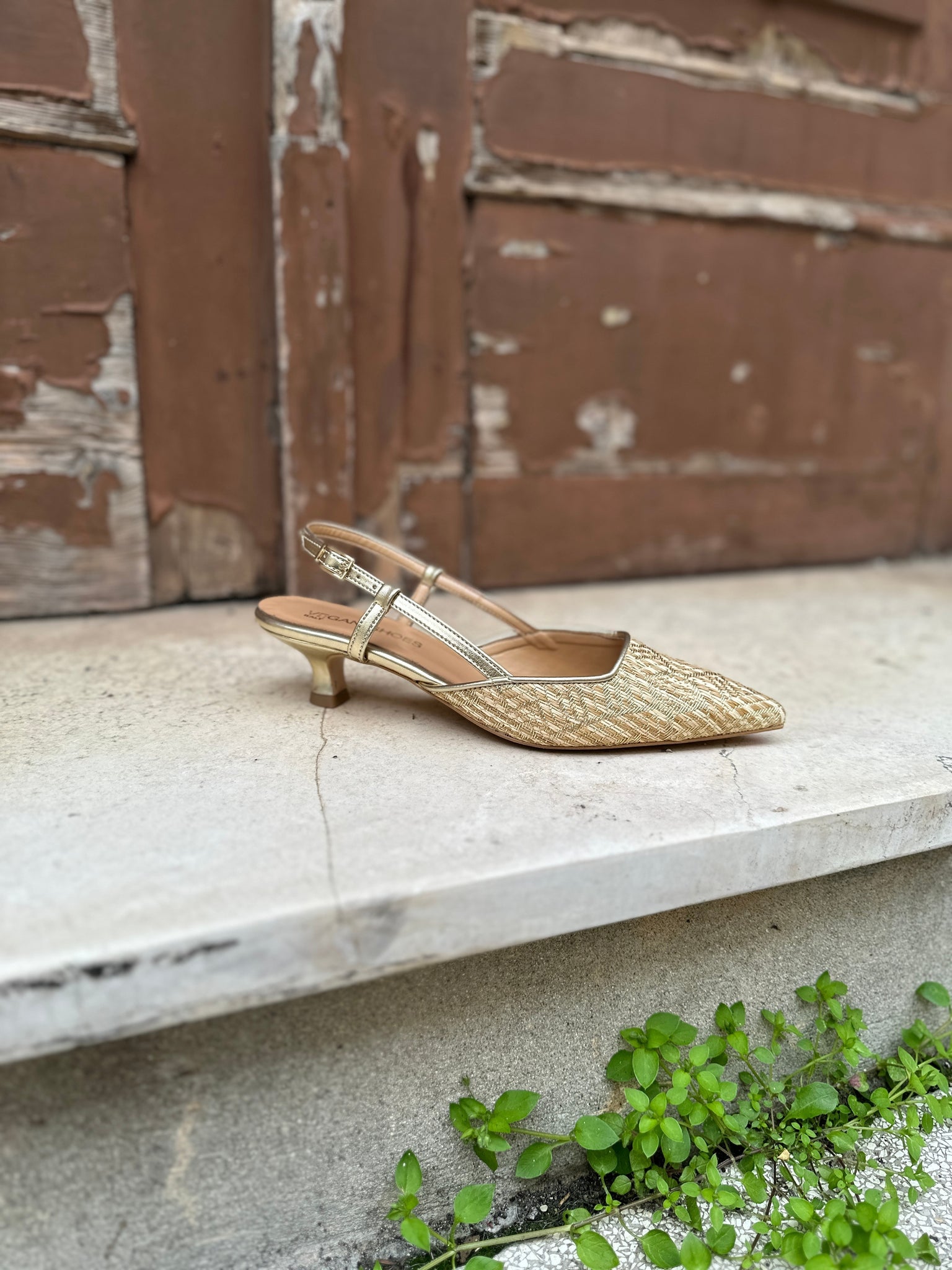Pumps with gold embroidered details on a woven raffia base, golden edging